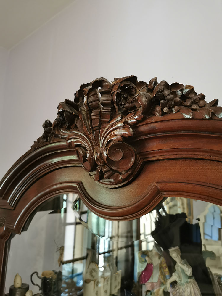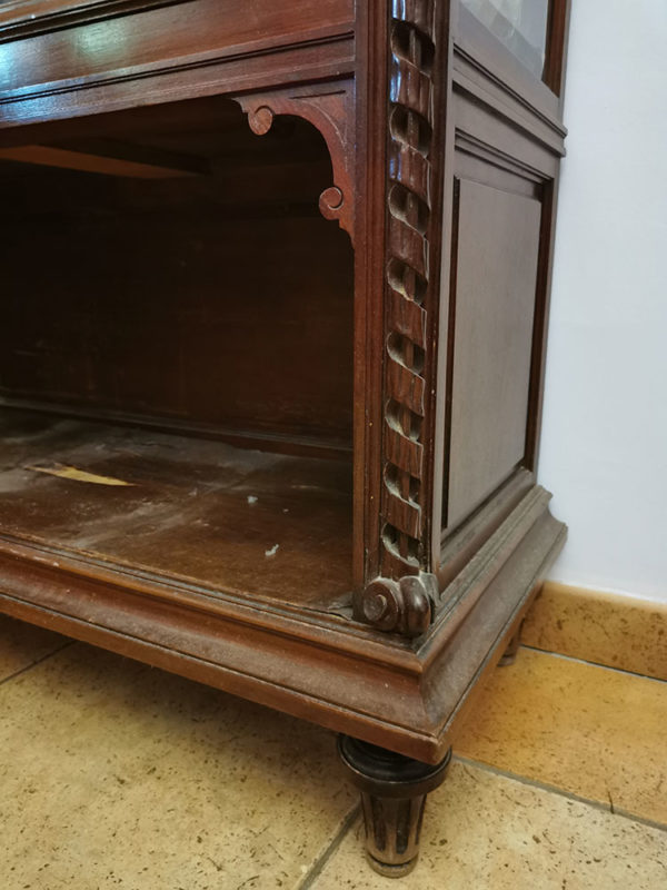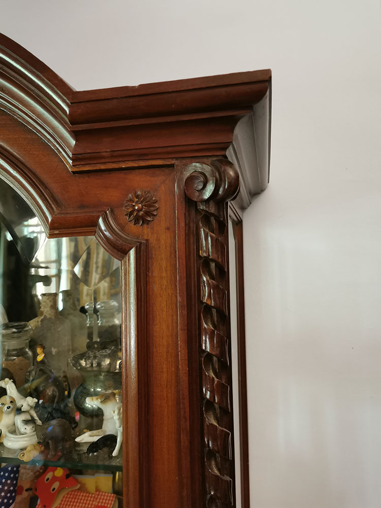 Vitrine (façade et 2 côtés vitrés), 4 étagères en verre, fond miroir, bois sculpté – fronton ruban feuilles d’acanthe – colonnes ruban – partie inférieure ouverte non vitrée – pieds cannelés – style Louis XVI – dernière étagère : plaquage arraché