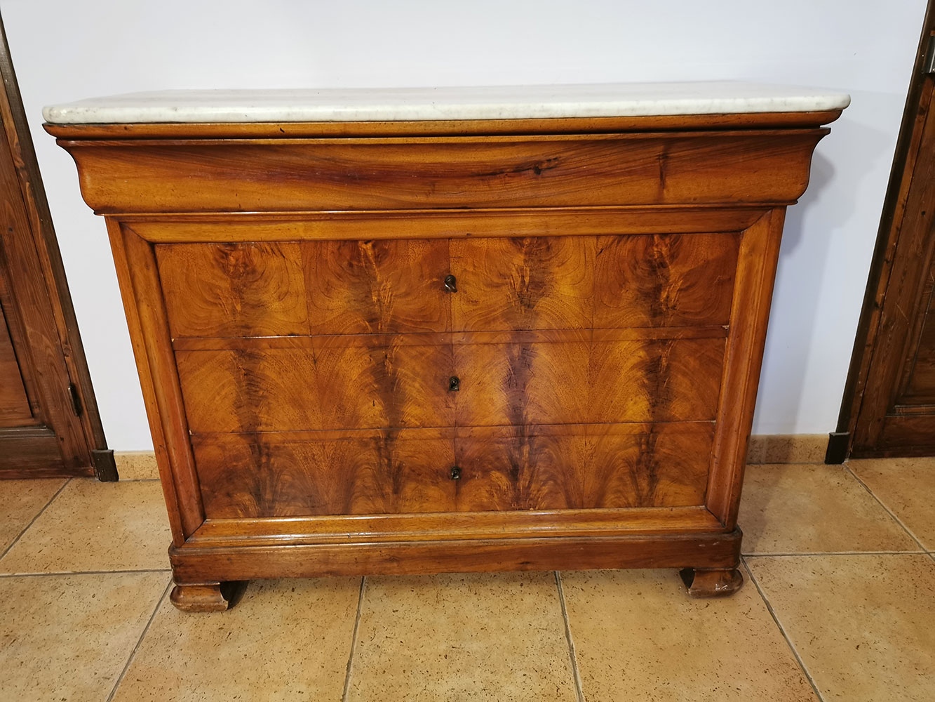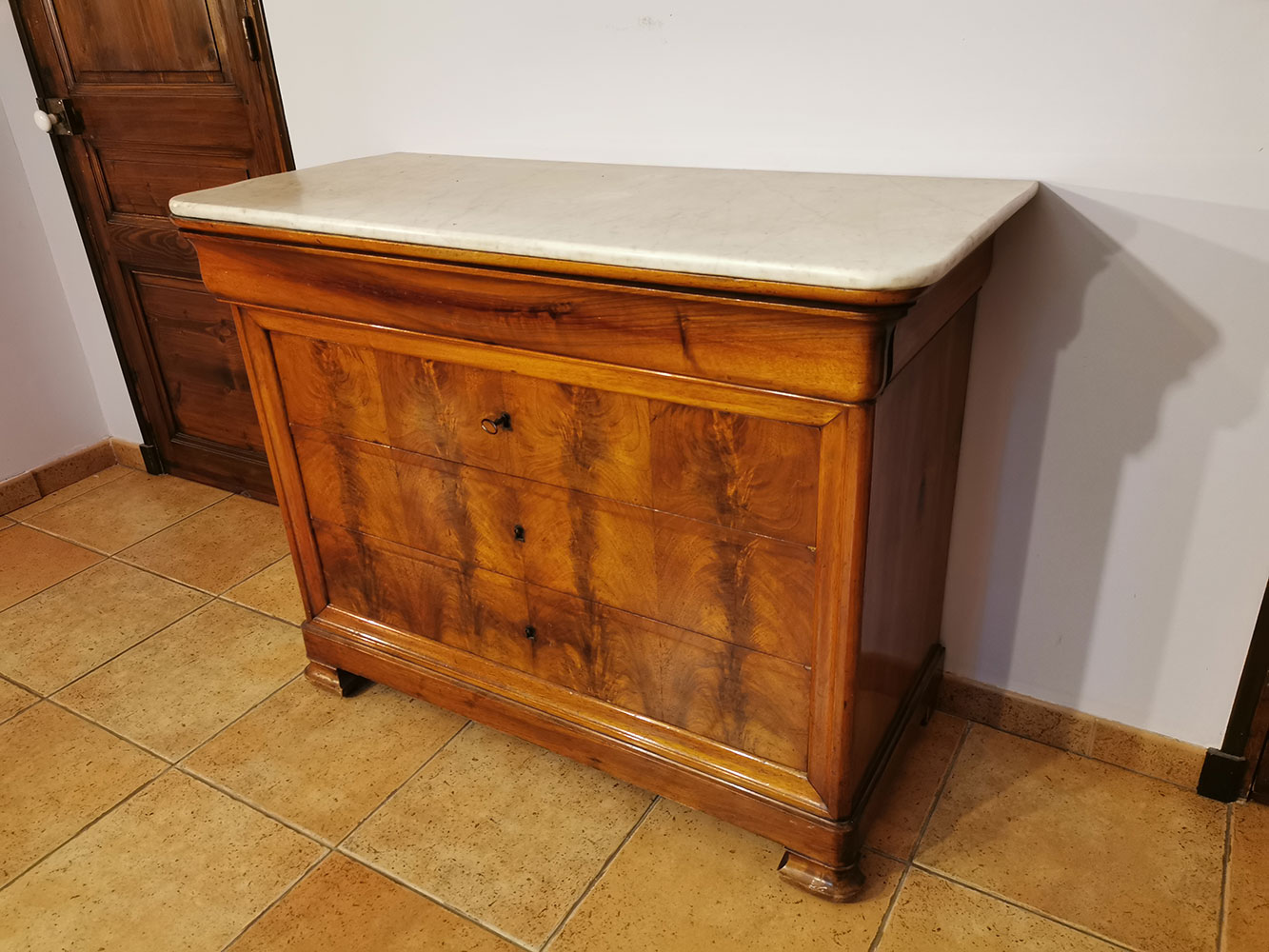 Commode en bois – 3 + 1 tiroirs – dessus en marbre d’origine – qq taches sur le marbre