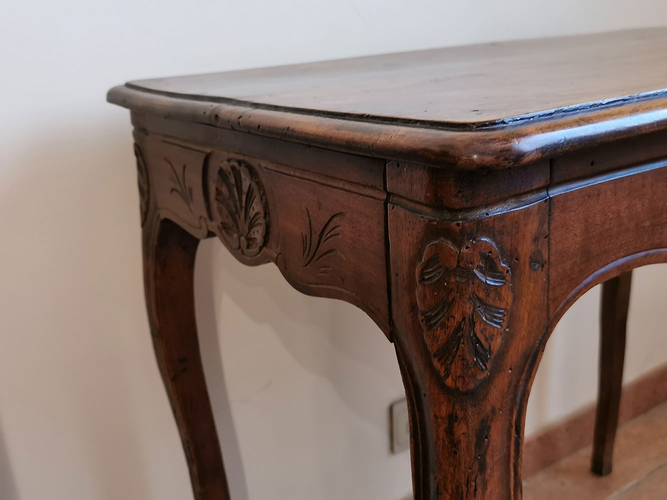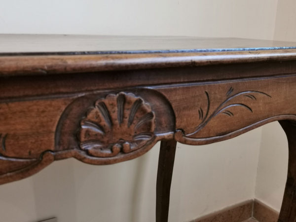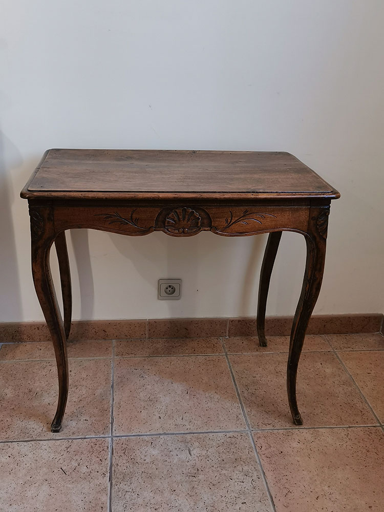 Desserte à 4 pieds, 1 tiroir, motifs de coquille simples, style provençal d’époque, restauration sur 1 pied