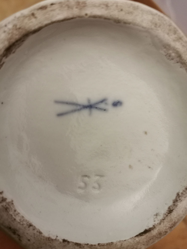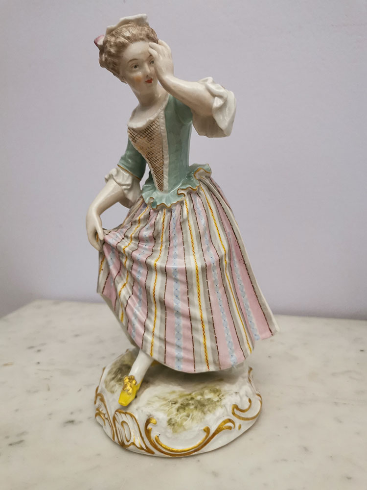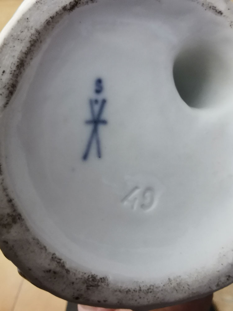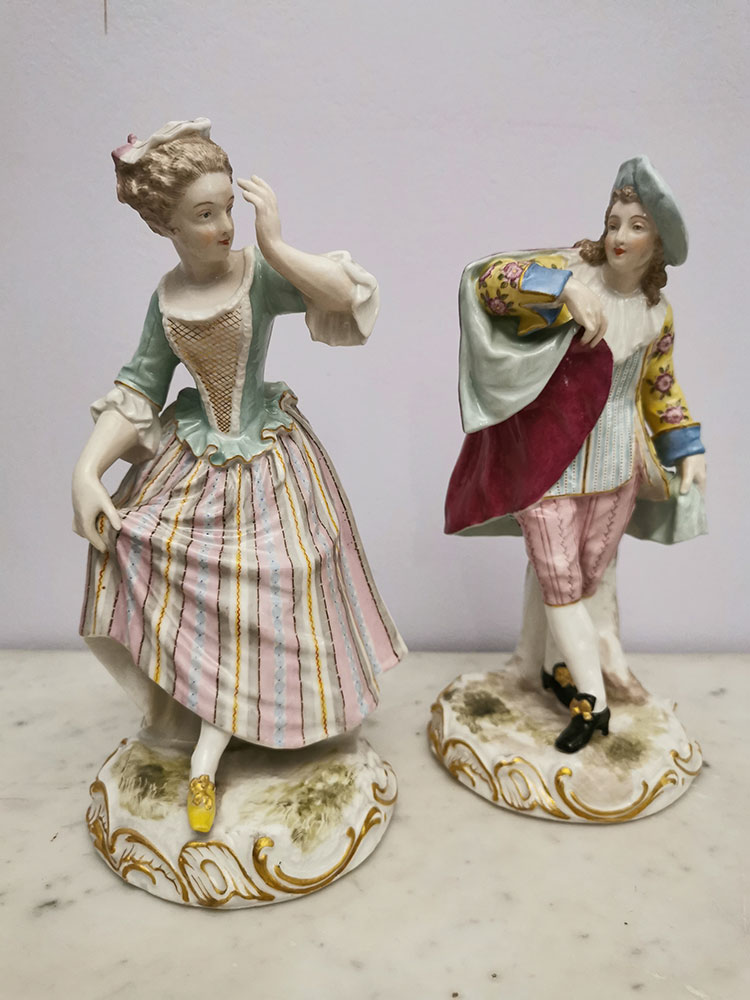 2 figurines en porcelaine émaillée – scène galante : 1 homme (n°49) + 1 femme (n°53) – signe : sorte de long croisillon surmonté d’un S – bon état
