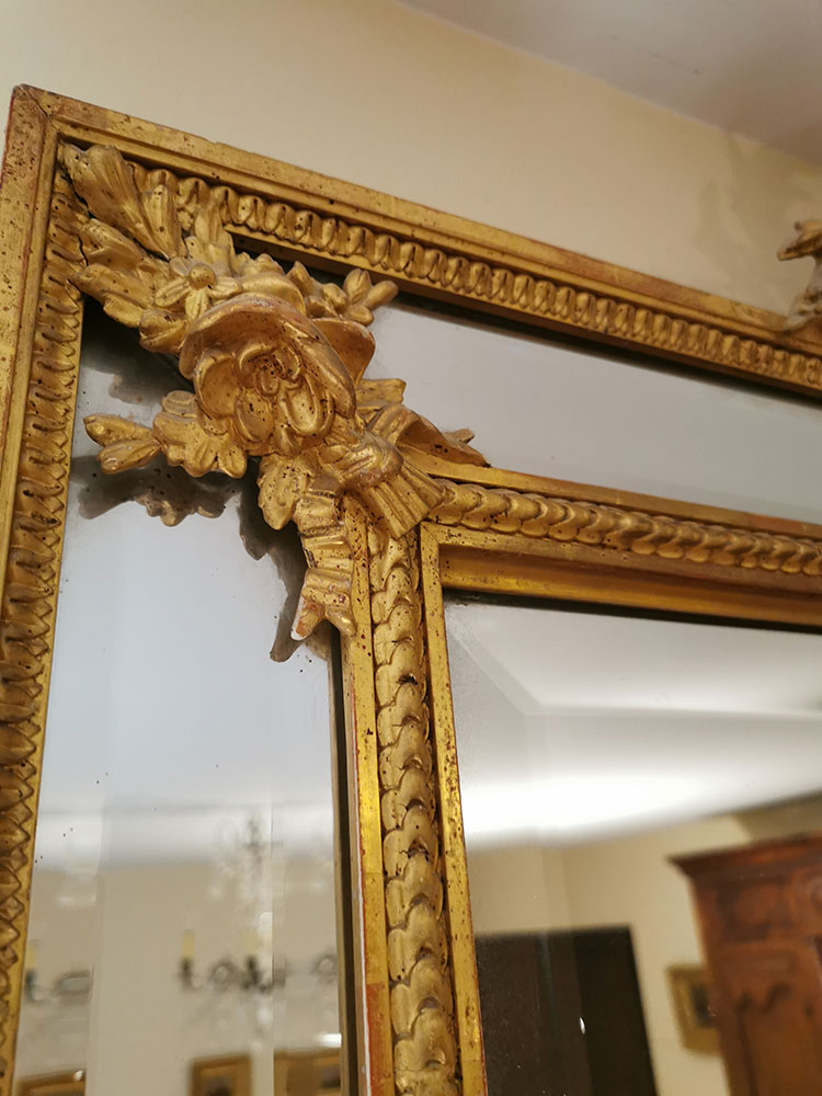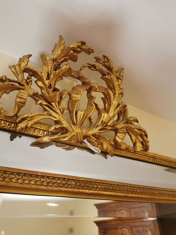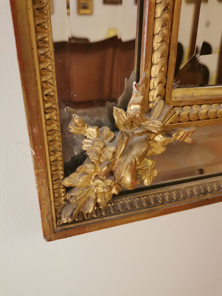 Miroir – contours biseautés dorés à la feuille – en médaillon : gerbe de blé et ruban – une partie en plâtre manquante sur le médaillon